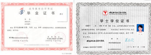 中飛院高教自考畢業(yè)證書、學(xué)位證書樣本