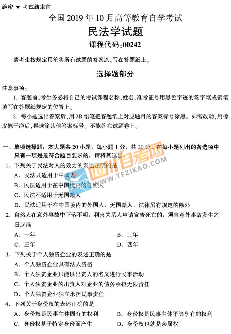 全國2019年10月自考00242《民法學》真題