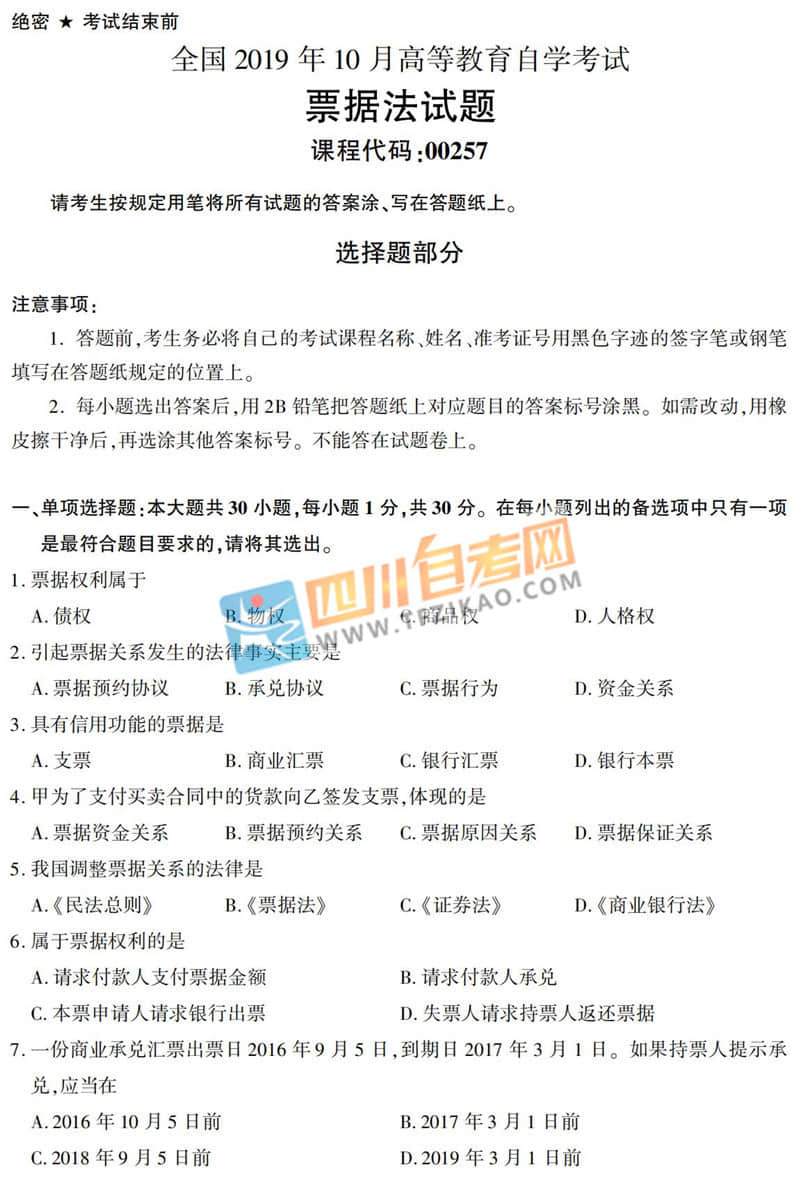 全國2019年10月自考00257《票據(jù)法》真題