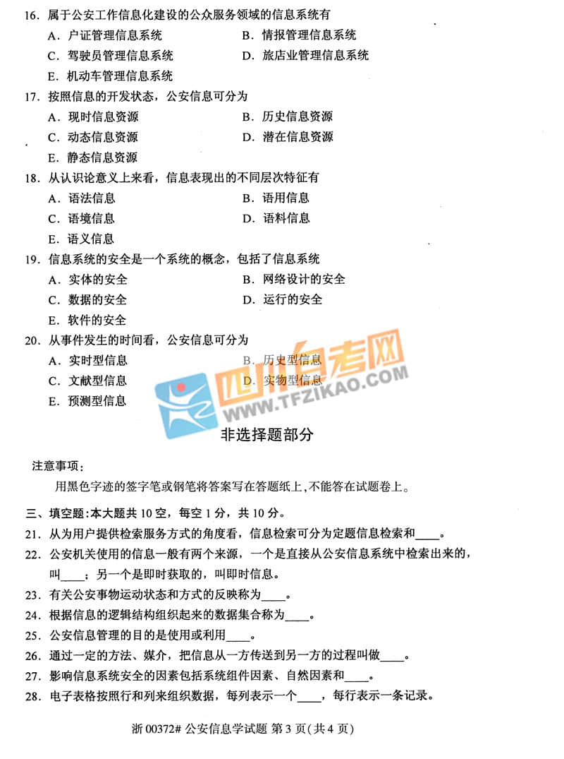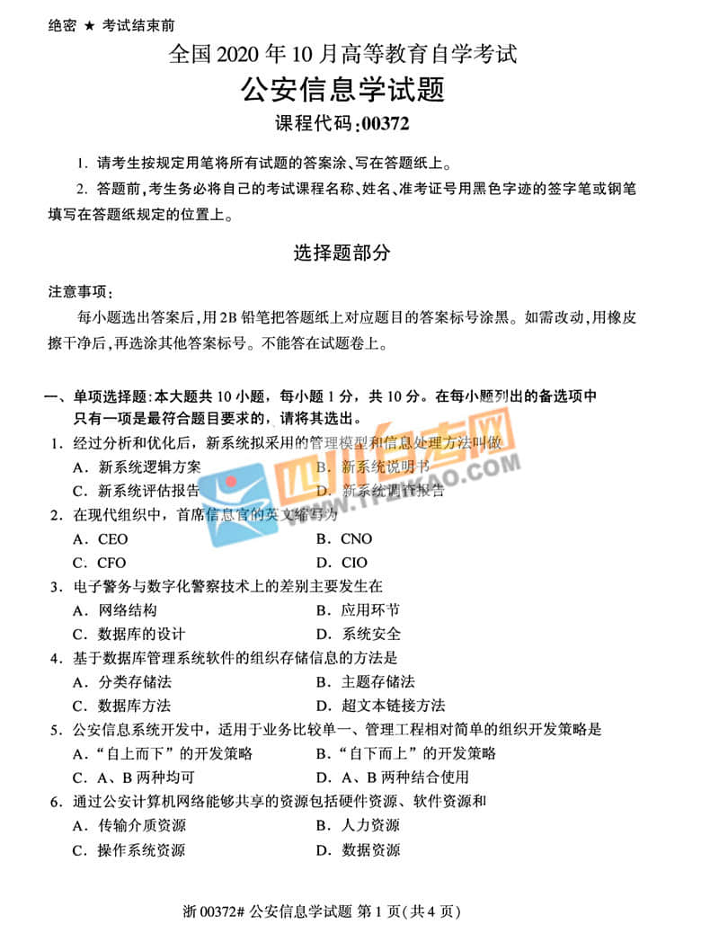 全國2020年10月自考00372《公安信息學》試題