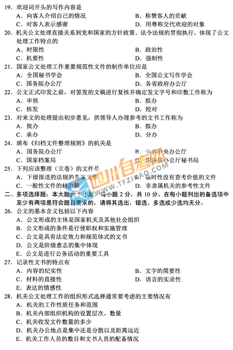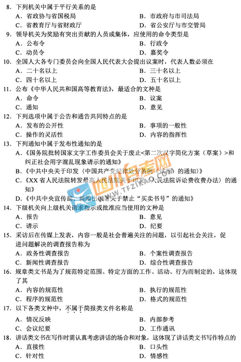 | 針對《公文寫作與處理》這樣的科目,應(yīng)該如何學(xué)習(xí)才能通過考試呢?四川自考網(wǎng)建議大家除了看教材以外,一定要多刷題,并且去理解記憶,不要死記硬背。下面給大家整理了 全國2020年8月自考00341《公文寫作與處理》試題,希望大家認(rèn)真做題,自查自糾,早日順利的通過考試。 |