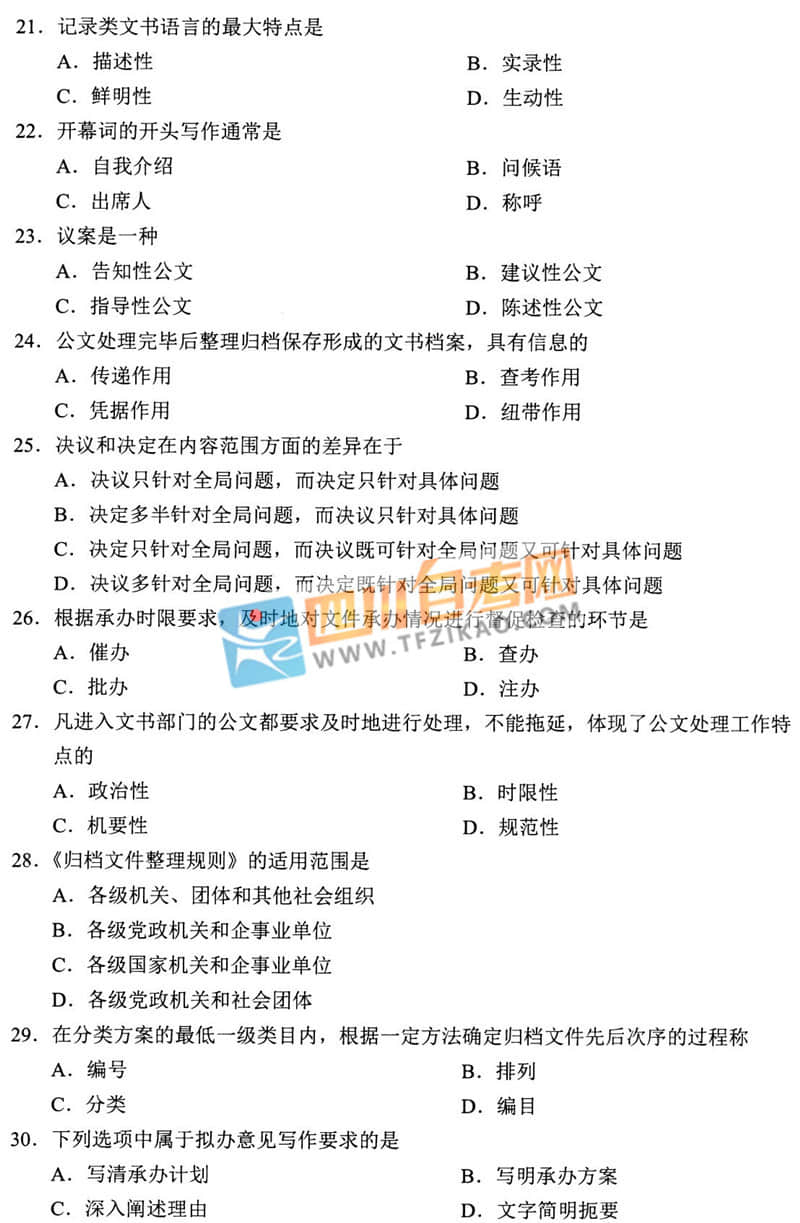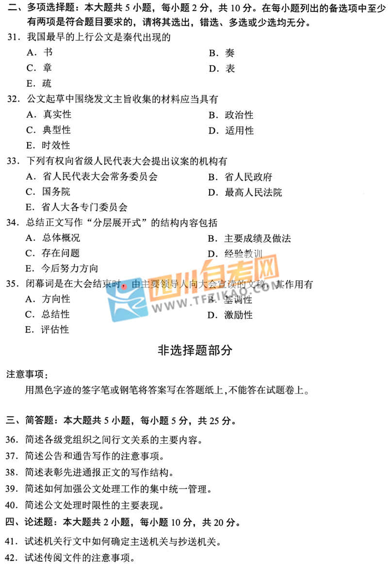 | 針對(duì)《公文寫作與處理》這樣的科目,應(yīng)該如何學(xué)習(xí)才能通過考試呢?四川自考網(wǎng)建議大家除了看教材以外,一定要多刷題,并且去理解記憶,不要死記硬背。下面給大家整理了 全國(guó)2019年10月自考00341《公文寫作與處理》試題,希望大家認(rèn)真做題,自查自糾,早日順利的通過考試。 |