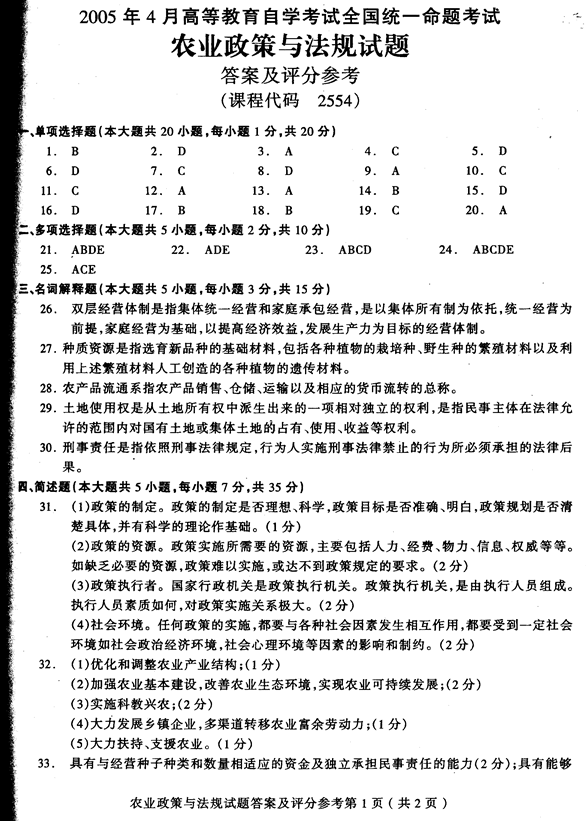 三、名詞解釋題(本大題共5小題,每小題3分,共15分) 26.雙層經(jīng)營體制 27.種質(zhì)資源 28.農(nóng)產(chǎn)品流通 29.土地使用權(quán) 30.刑事責(zé)任 四、簡述題(本大題共5小題,每小題7分,共35分) 31.制約農(nóng)業(yè)政策實(shí)施的因素主要有哪些? 32.簡述農(nóng)業(yè)穩(wěn)定發(fā)展的主要措施。 33.申請領(lǐng)取種子經(jīng)營許可證應(yīng)具備哪些條件? 34.政府對農(nóng)業(yè)投入資金管理的主要職責(zé)。 35.簡述鄉(xiāng)鎮(zhèn)企業(yè)的性質(zhì)和主要任務(wù)。 五、論述題(本大題共2小題,每小題10分,共20分) 36.確保我國糧食穩(wěn)定增長的主要措施。 37.論述加快我國農(nóng)業(yè)科技與教育發(fā)展的基本措施。